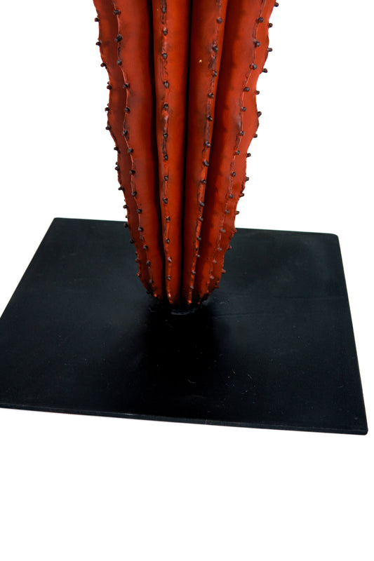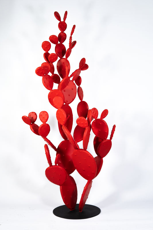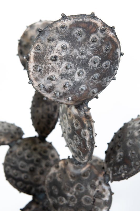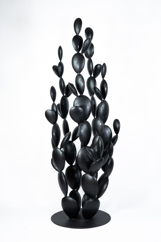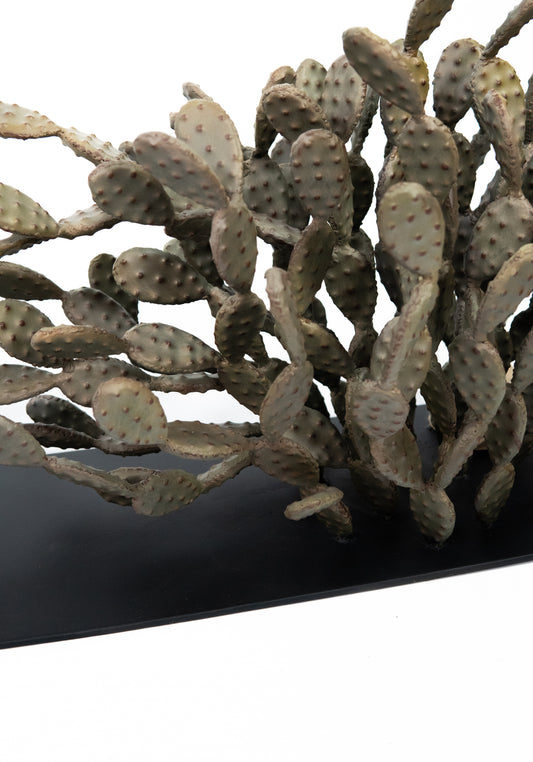 Façonnée entièrement à la main,la tôle épaisse de fer, si froide et si dure à la base, s’assouplit, se plie, se courbe, se froisse, se pigmente et se nuance. Le métal modifie sa nature austère et laisse découvrir, plus qu’une texture, un véritable épiderme, qui, privé ici de ses épines, offre une douceur veloutée aussi vraie que nature.